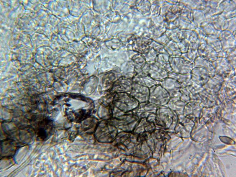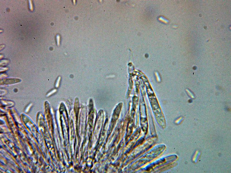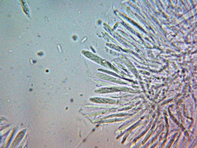 En cuanto a las paráfisis, quizás por mi torpeza, no he observado en las muestras nada que sea muy distinto de los ascos, mezcladas con quizás ascos inmaduros, con lo que no puedo opinar sobre el contenido de las supuestas paráfisis, el himenio con la aplicación de KOH simplemente se volvió hialino.