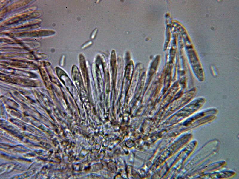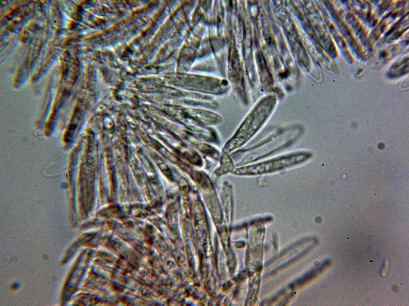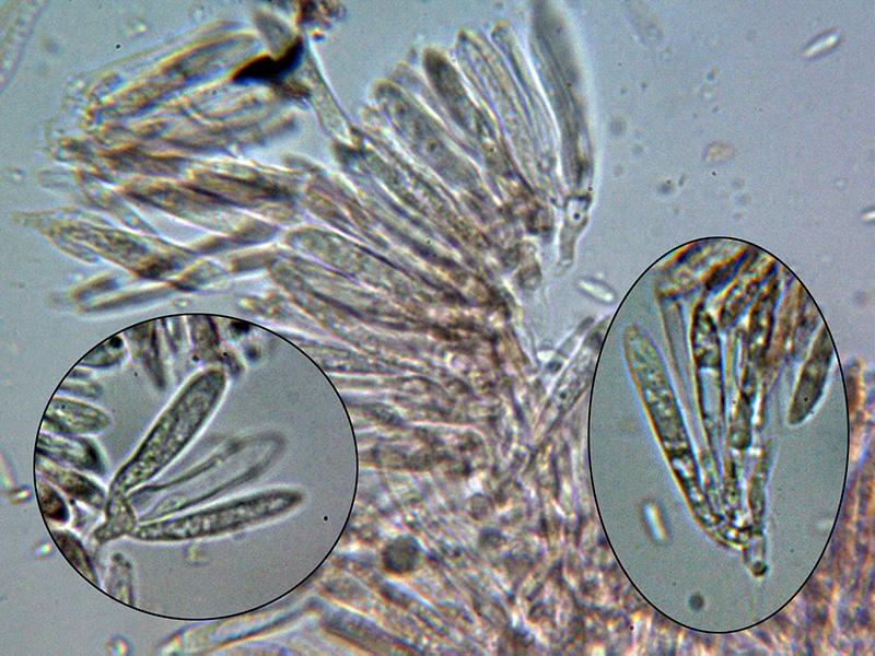 Ascos al parecer octospóricos, con unas medidas de 26.3 - 37.5 × 4.4 - 4.8 µm., con reacción amiloide en el diminuto aparato apical, no se aprecian croziers en la base (-).