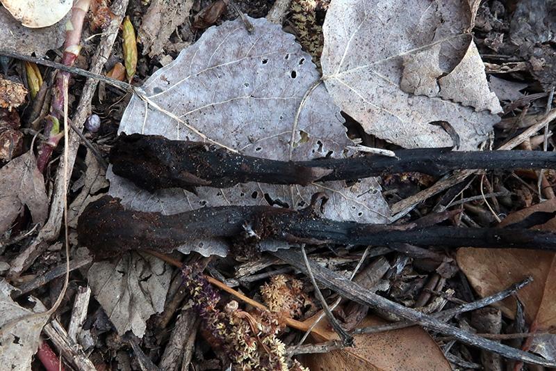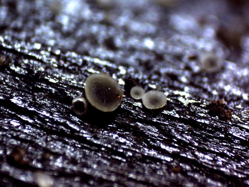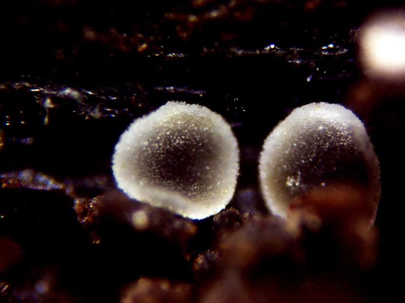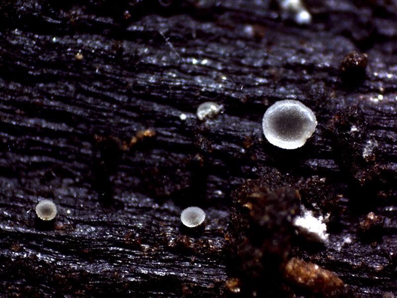 Miuy diminutos apotecios con forma de disco blanco, pié casi inexistente, brotando sobre la parte baja de unos tallos secos de Orobanche hederae.
