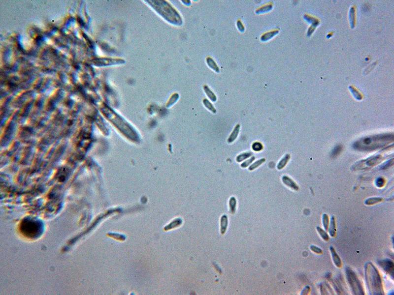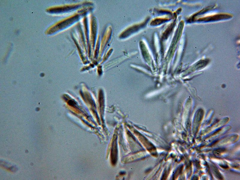 Esporas algo fusiformes, con un extremo redondeado y el otro apuntado, de pared fina, con tenues y diminutas granulaciones en su interior y unas medidas en agua de:
