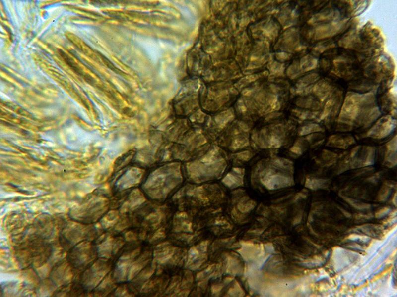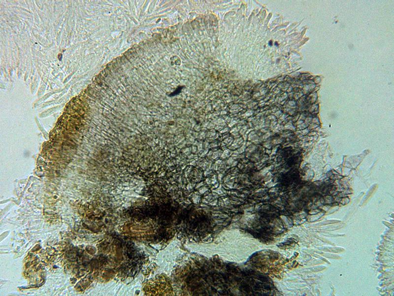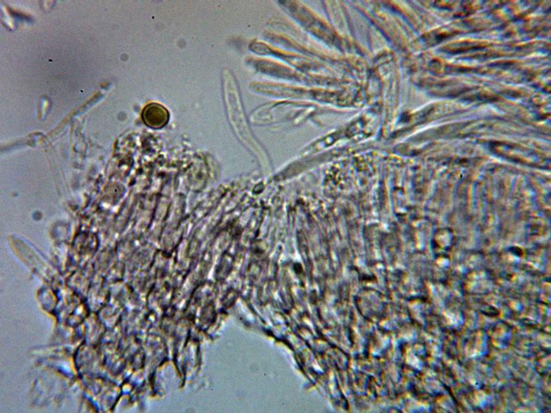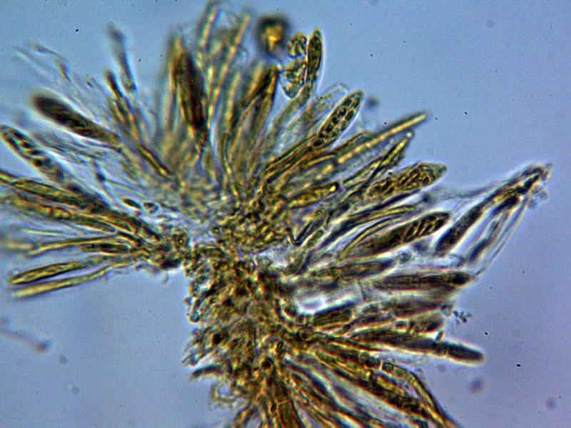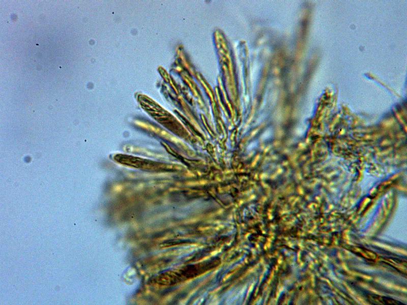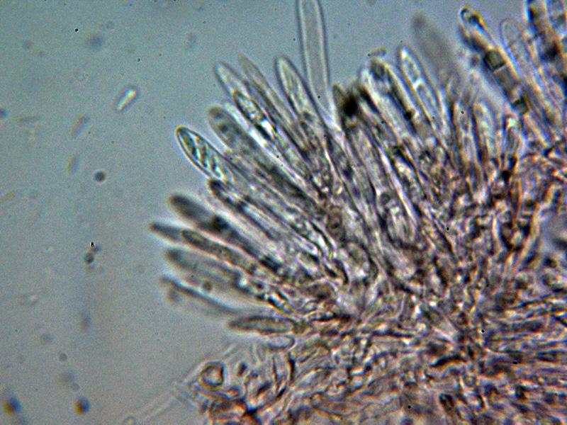 Hifas terminales marginales dispuestas perpendicularmente, hialinas y septadas, de entre 27.1 - 33.9 × 3 - 5.12 µm. con 3 a 4 septos con consteñimiento en los mismos, con una sustancia amorfa a modo de suciedad en su superficie en las muestras montadas con agua, esta suciedad se disuelve en KOH dejando su superficie ligeramente pigmentada de marrón ocre claro.