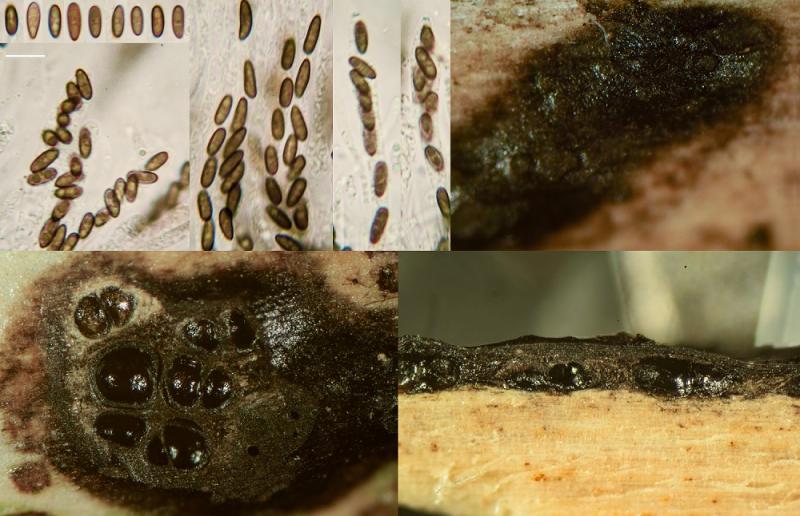 Asci, 8-spored, I+ blue, rather low. Spores medium brown 8,0-9,9 (av. 8,6) x 3,7-4,1 (av. 3,9) µm, n=6, without appendages; germ slit faint but full length and straight.