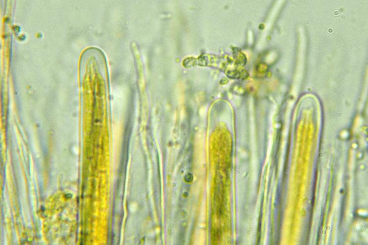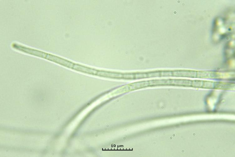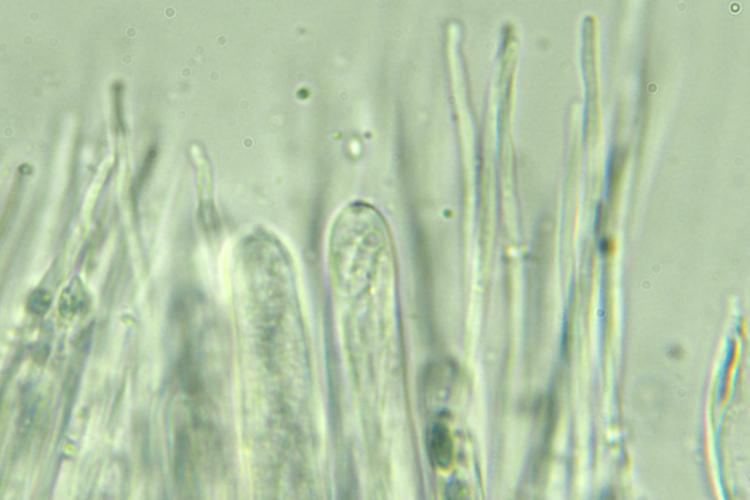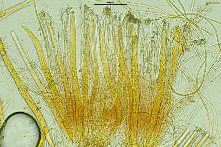 I measured just a couple spores and asci and they measured 260 - 280 x 2.5 and 190 x 10 microns. The spores were arranged in the asci partially in a spiral fashion and partially in a parallel fashion. The lower part of the hymenium turned orange in IKI.