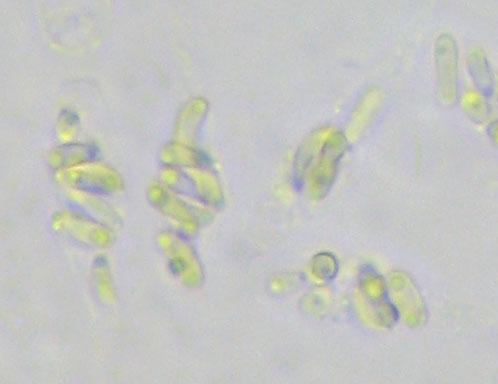 Spores small, variable in shape and size, 3,5 - 6 x 1 - 1,8 µm, often slightly bent, sometimes strongly, pale yellow brown under the microscope.