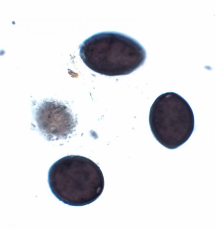It burst when I tried to remove it so I am not sure whether the dark spores (15um) are anything to do with it or just "contamination". The globular elements on the side and at the apex of the neck I assume are part of the specimen(25um).