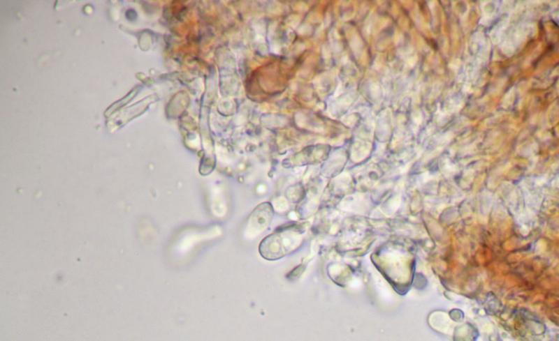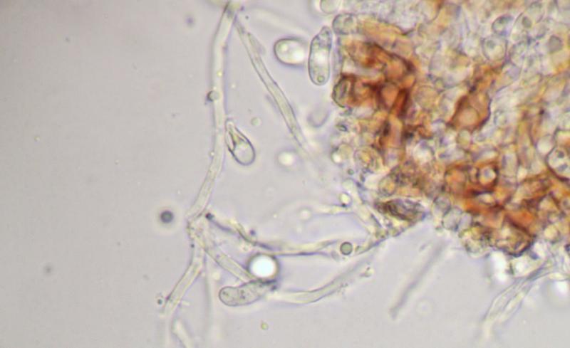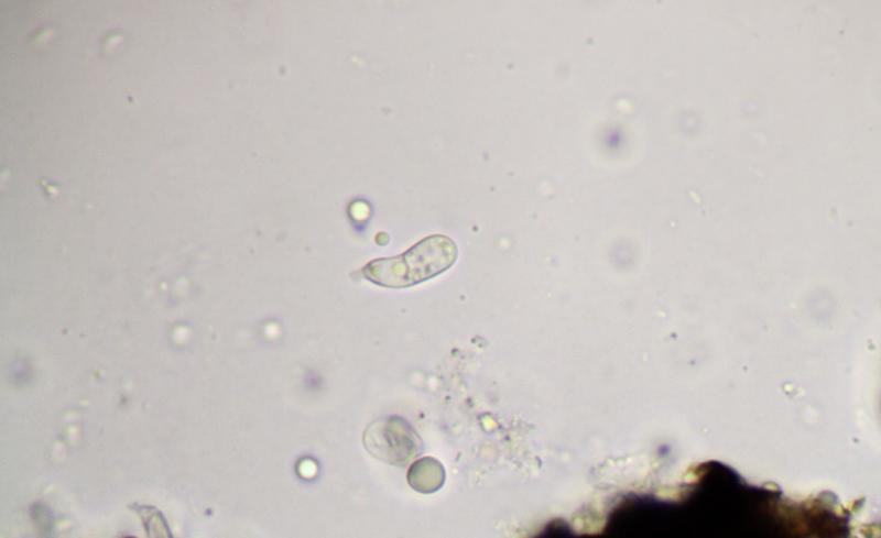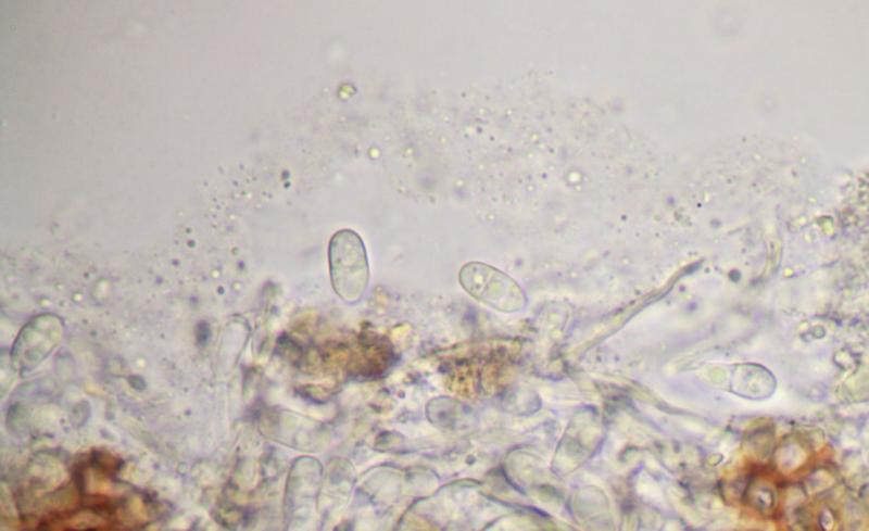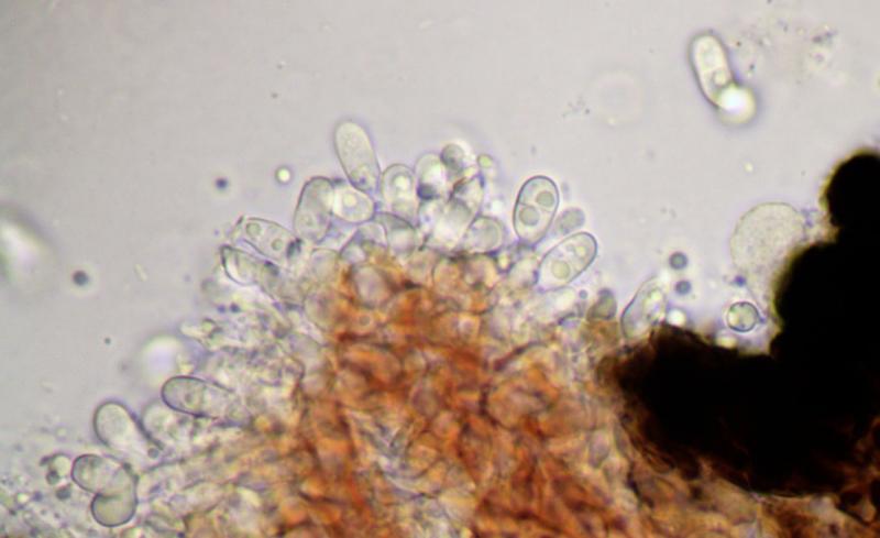 Au microscope, des conidies elliptiques, hyalines, guttulées, septées, mesurant 7,5-11 x 4-4,5 µm.