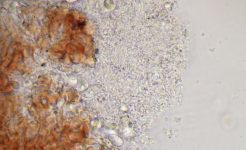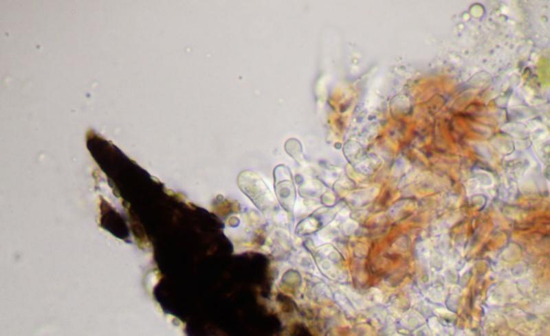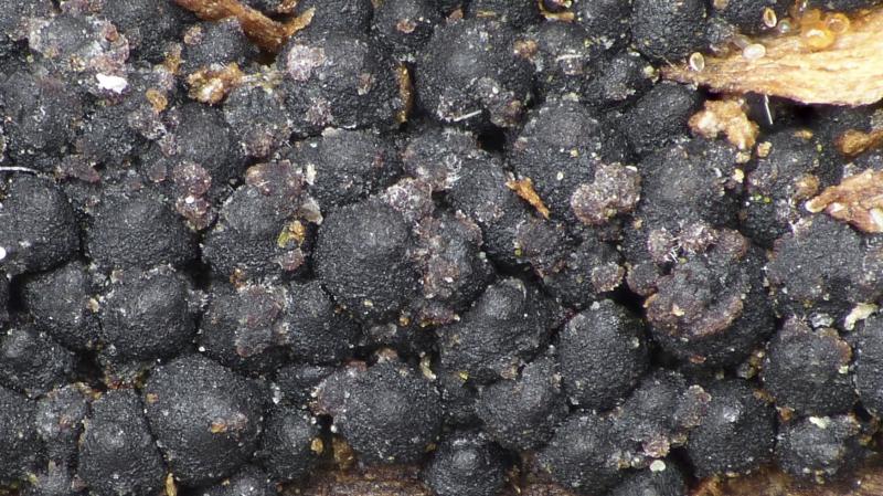 En passant ma récente récolte de Praetumpfia obducens, je remarque que certaines frutifications sont couvertes par des coussinets brun-rose d'aspect cotonneux.