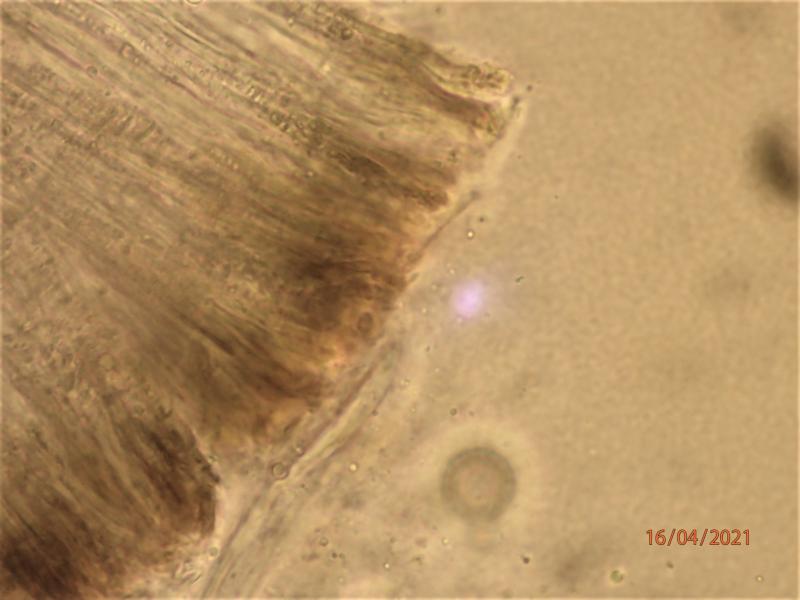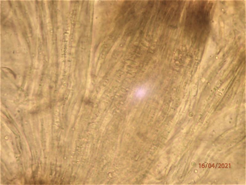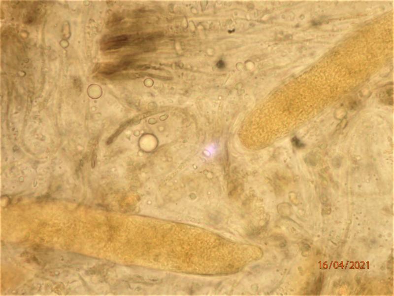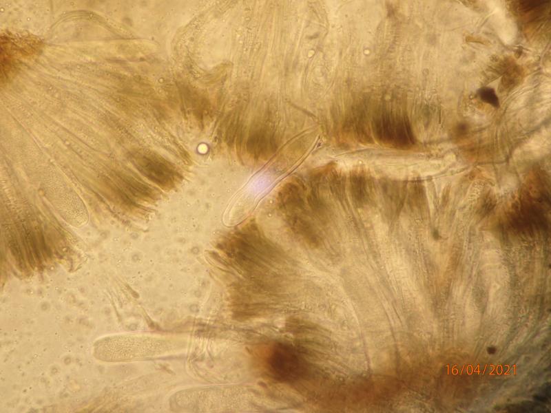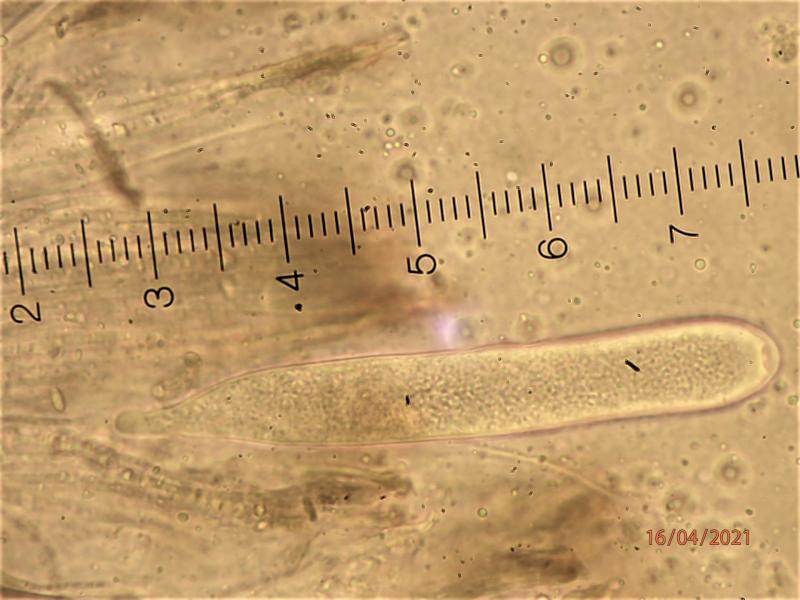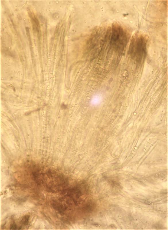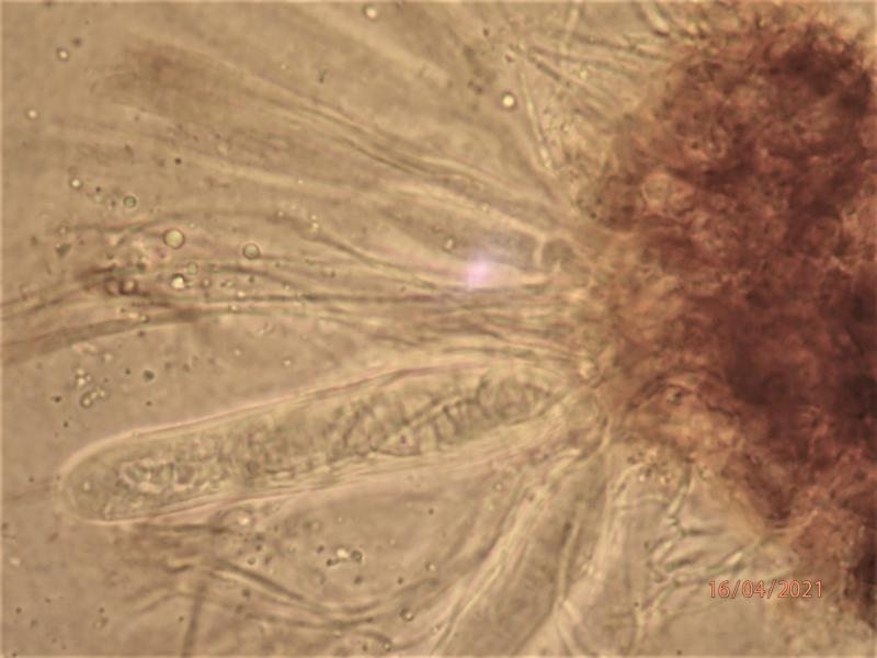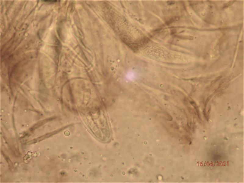 Asci 75-125 x 12-18 microns (in water), IKI-. Asci mostly with granular contents, but a few beginning to form septate spore, difficult to measure presicely. Paraphyses agglutinated in a greenish/olivaceus matrix (resinous material?), apparently with transverse, elongate "bodies". Subhymenium brownish.