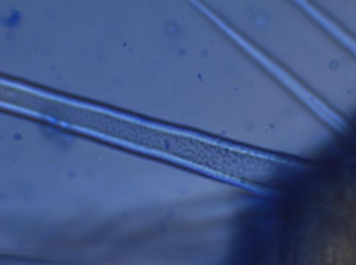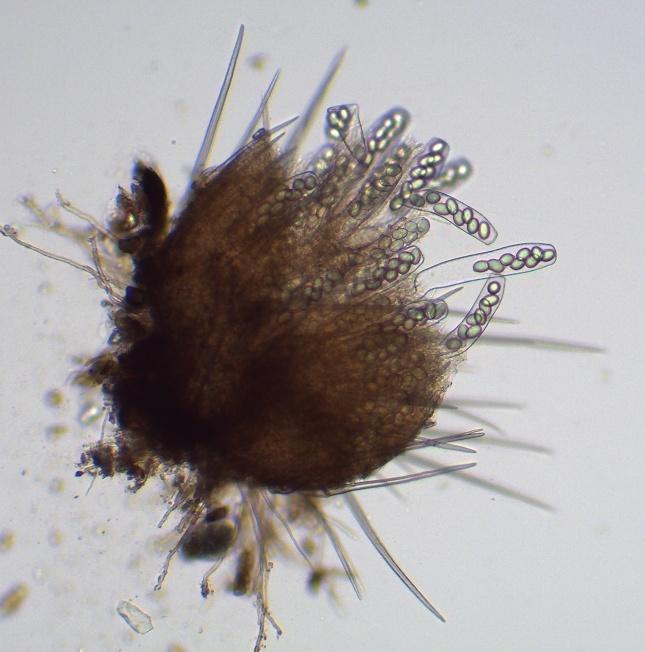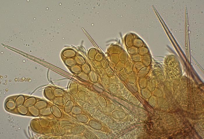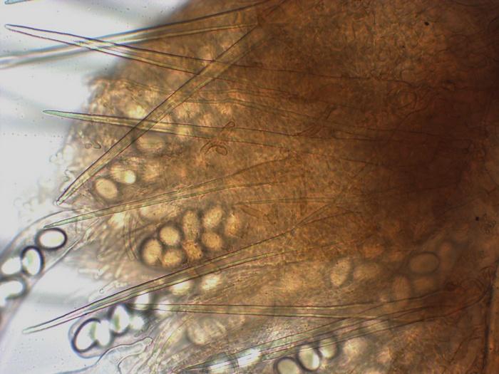 Poils étroitement coniques, parfois presque cylindriques, à pointe acérée, 150-247 x 10-17 µm, paroi épaisse jusqu'à 2 µm. Surface finement rugueuse, avec de très petites verrues ou rides qui fixent le bleu coton acide lactique (cyanophilie). Dans le Melzer, les parois prennent une couleur rouge (réaction dextrinoïde). Cloisons absentes à très rares (sur une seule apothécie, un poil à deux cloisons vers le sommet a été observé). Base simple.