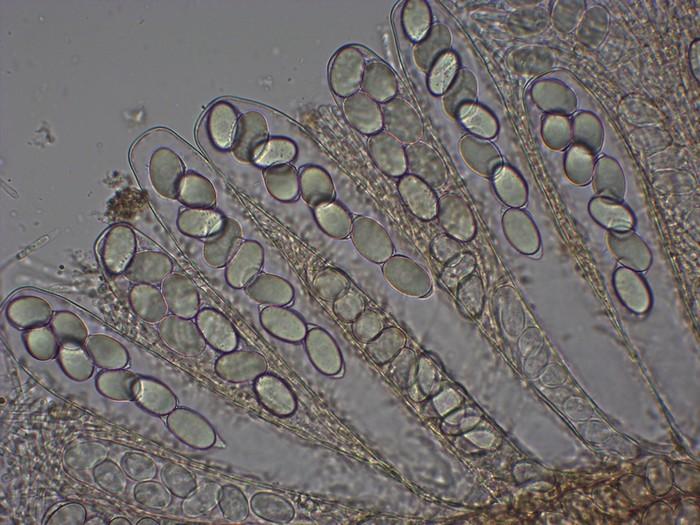 Asques cylindracés, 205-217 x 32,5-35 µm, à court pied, à sommet presque plan, contenant 8 spores irrégulièrement unisériées.