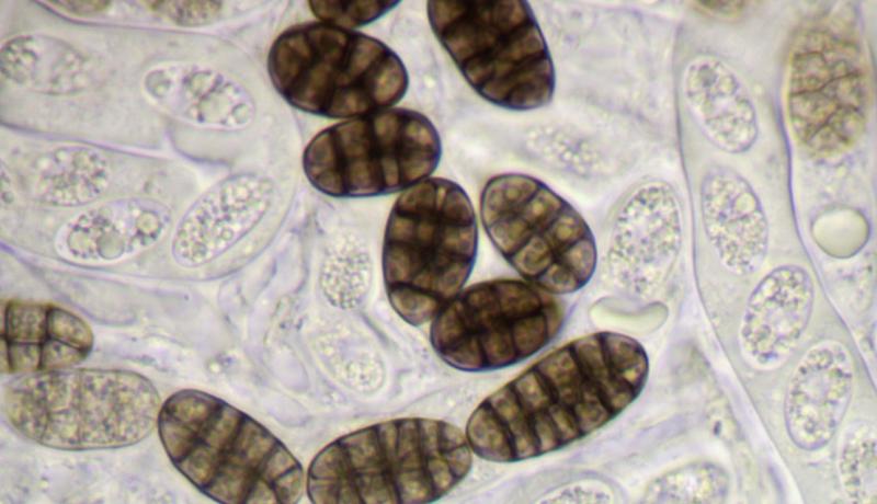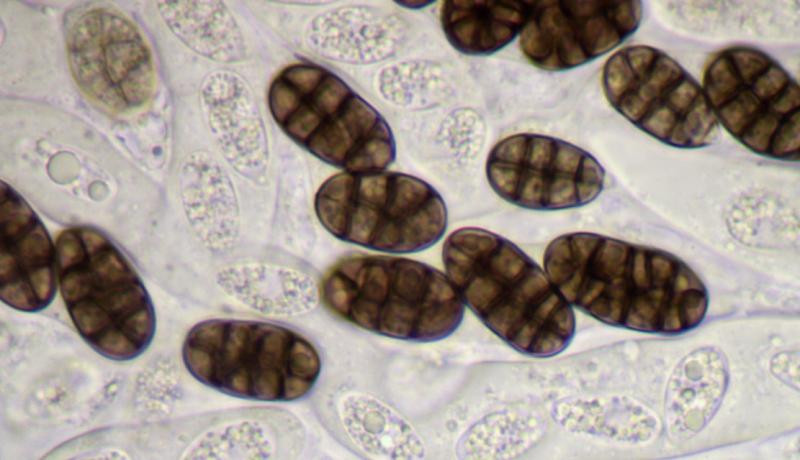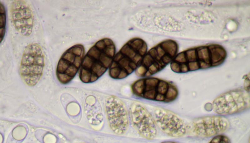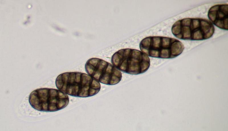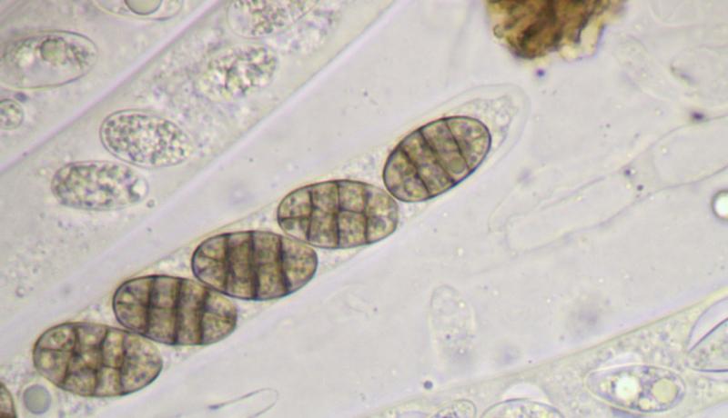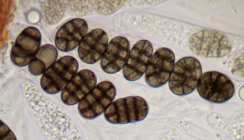 Ascospores : mûriformes, oblongues, brun-gris, avec 3-5 septas transversaux et des septas longitudinaux, 15-24 x 9-11,5 µm ; m : 20 x 10 µm ; 1,6-2-2,4.