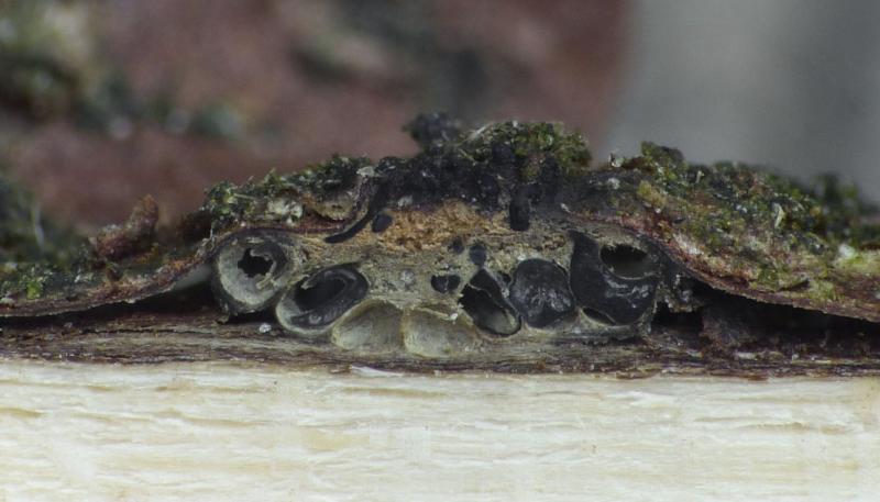 Sur branche morte attenante d'Ulmus glabra, en compagnie de Nectria sp.
