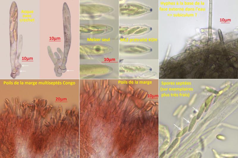 -poils de la marge multiseptés souvent >60µm (jusqu'à >80µm ?) observés dans le Congo SDS car j'ai eu du mal à les trouver/différencier des paraphyses dans l'eau. Longueur des articles 15µm et largeur 5µm.