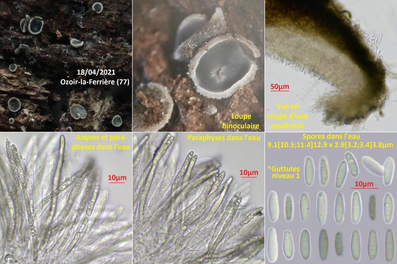 Cup-like apothecia, sessile, gregarious, brown/greyish, Ø1 à 2 mm ; margin clearer.