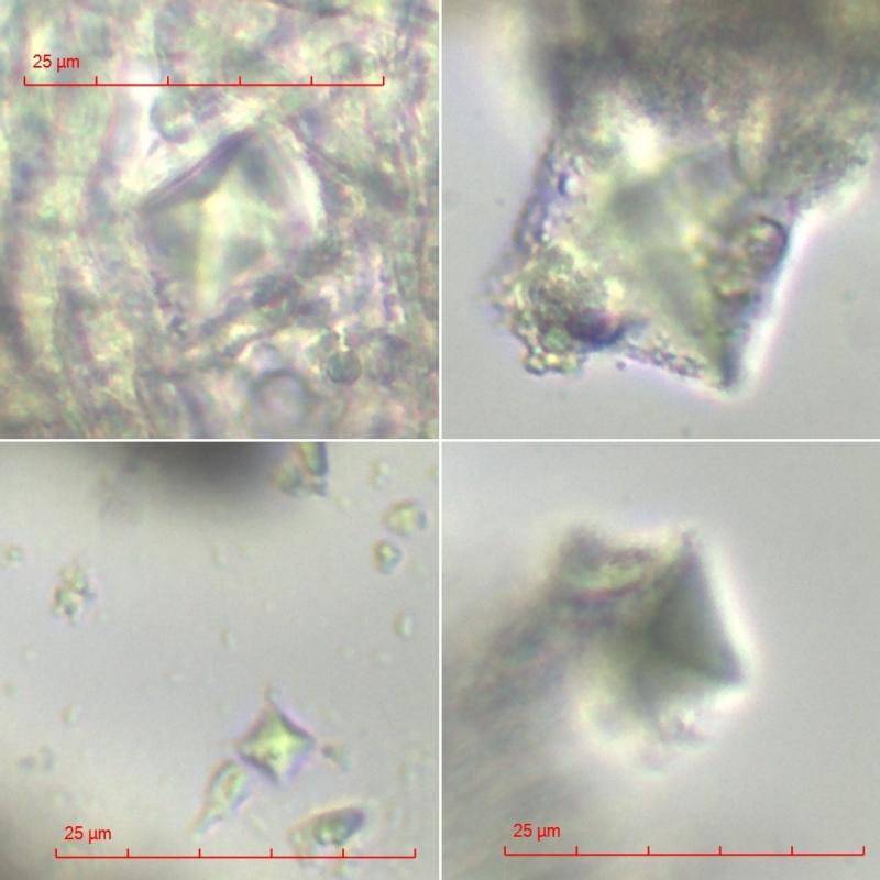Même si cela a peu d'importance, je me suis remis en question et j'ai refait une micro de mon Dasyscyphella trouvé à côté de ce Mollisia. J'y ai bien trouvé des cristaux octaédriques finalement, cf photo jointe, ce qui fait que c'est comme tu le disais Dasyscyphella nivea (je suis ainsi pile dans la configuration lue sur la clé d'Andreas Gminder). Je me demande si je n'ai pas bêtement, la première fois, fait mon observation dans le KOH qui aurait dissous les cristaux. J'édite le post.