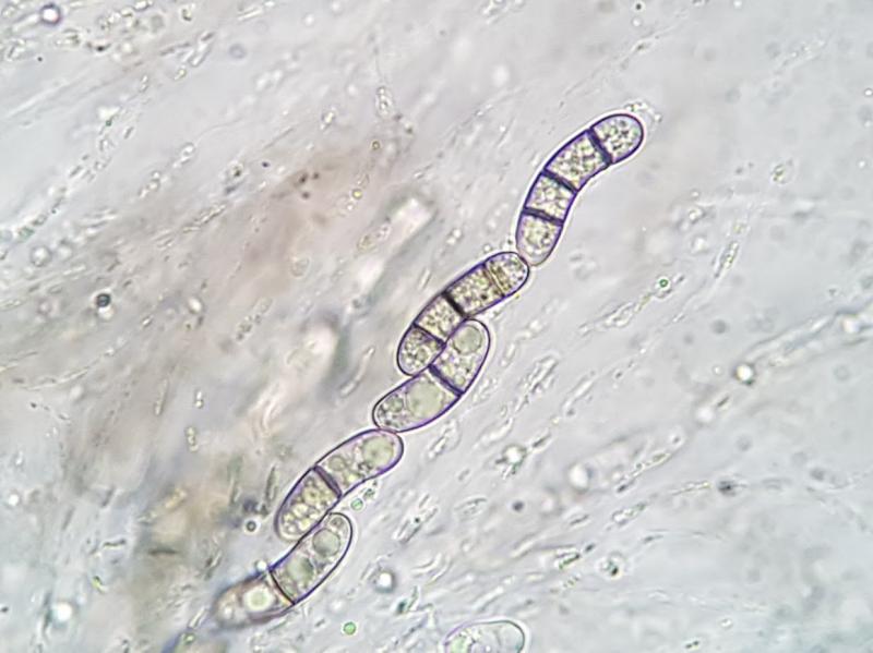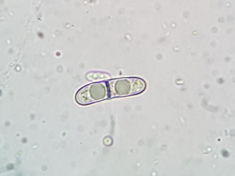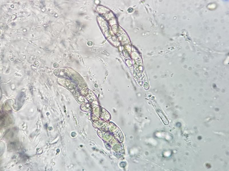 Spores 18-25 x 5, 1-3 septate. First hyaline, becoming grey-brown. 8/asci.