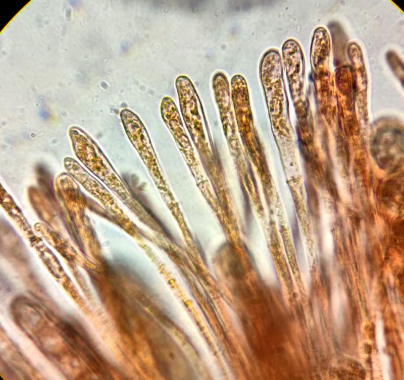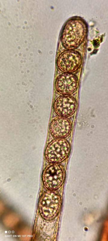 ses spores sont très légèrement ellipsoides (19,3 x 15,5µm Qe=1,3) et ont une ornementation à verrues, crêtée, limite réticuleuse. Je n'avais pas de bleu de crésyl pour bien observer l'ornementation.