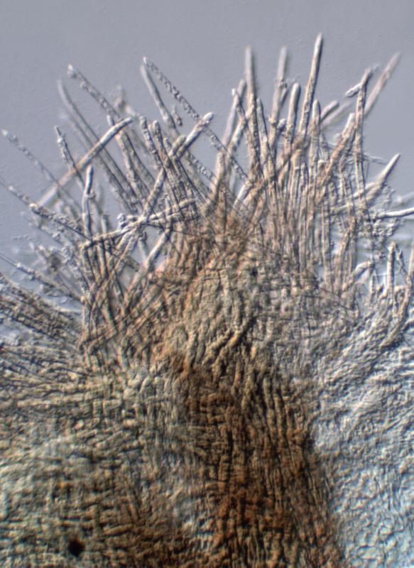 The collection was kept damp for several days in the fridge to allow it to mature a little with no disturbance, and this is probably why the beautiful development pattern of the hairs - like feathers on a bird - is shown.