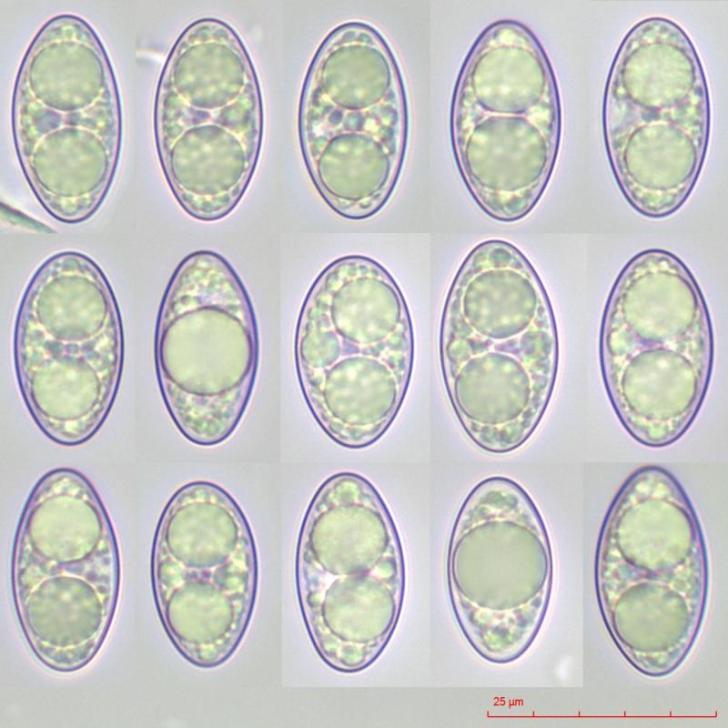 Les spores (issues de sporée) sont elliptiques, lisses, avec généralement 2 grosses guttules réfringeantes dans l'eau ; 15 mesures = 19.8[21.1;22.0]23.3 x 10.8[11.5;12.0]12.7 µm. Leur contenu renferme de très nombreuses petites guttules qui remplissent entièrement le volume.