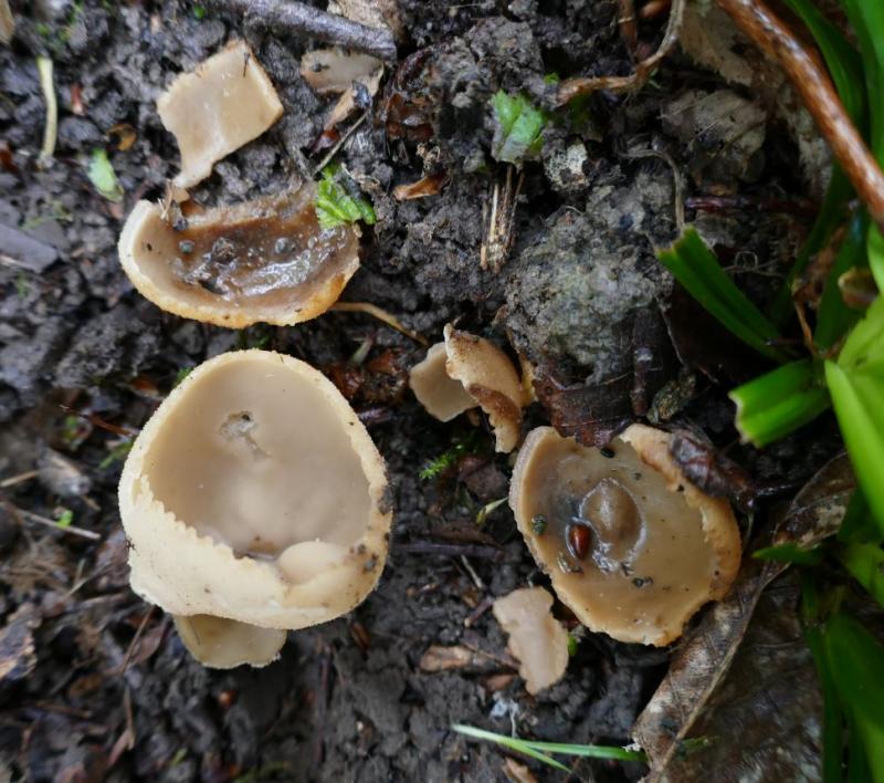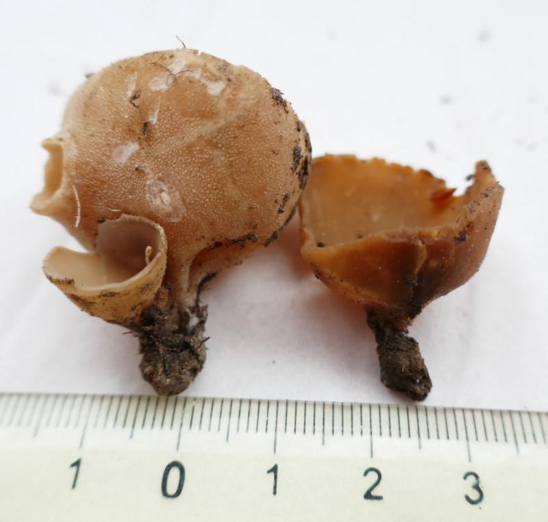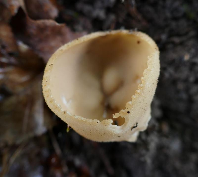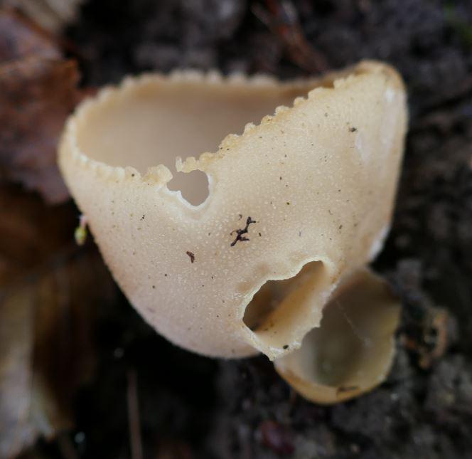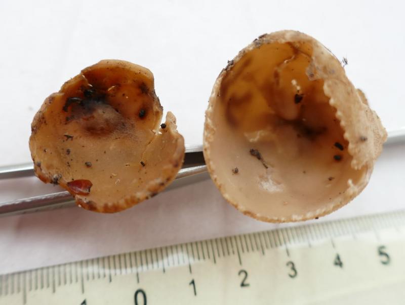 Apothécies en coupe de 30mm de diamètre pour 25mm de haut, assez robustes, à marge crénelée, courtement stipitées, à hyménophore beige à ochracé pour les plus vieux exemplaires. La face externe est plus pâle, furfuracée et dépourvue de poils.
