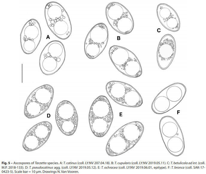 J'ai lu avec intérêt le document d'Ascomycete.org "Preliminary notes on the genus Tarzetta (Pezizales) with typifications of some species and description of six new species", et je m'interroge sur la Fig.5 que je joins dans les photos ; les petites guttules représentées dans le dessin ont-elles une valeur taxinomique ? Le descriptif des différentes espèces dans le reste du document ne semble pas le mentionner.