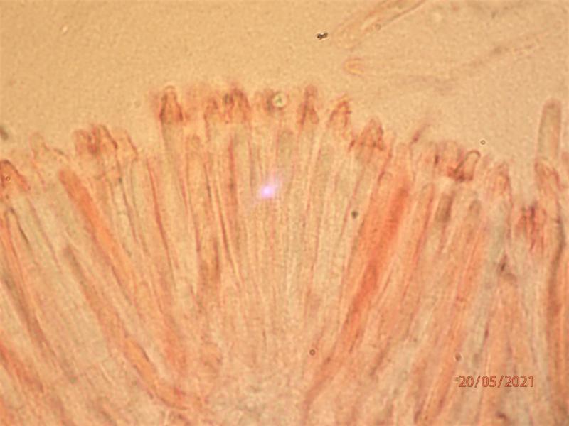 This beautiful pink Orbilia was growing on a thin Ulmus twig near Oslo, Norway. Apothecia 0.5-0.7 mm. Margin almost dentate from bundles of glassy (?) hairs. I am struggling to see the spores clearly inside the asci, and even more difficulties photographing them with my simple setup, but they appear clavate-fusiform (rounded apically) with one apical SB occupying only a small area of the spore. It's difficult to see the shape of the SB, but definitely somewhat longer than wide. The paraphyses are septate, cylindrical and with a triangular exudate cap (stained in CR). Dead (?) asci are apically truncate. There are large, globose cells n the ectal excipulum. I am quite sure there are croziers. And finally, there are bundles of glassy (?), elongate cells, presumably forming the dentate margin.