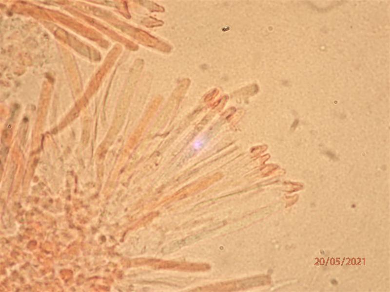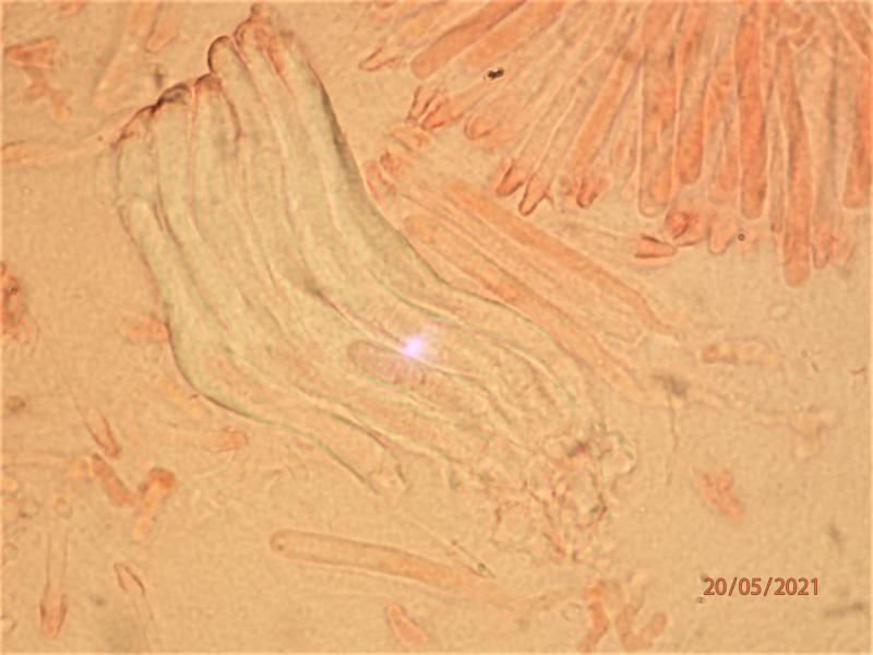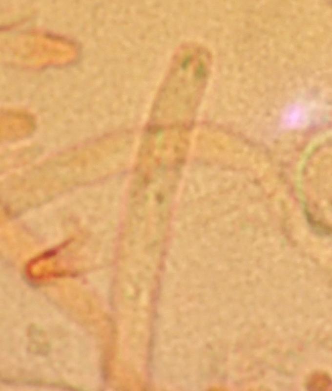I have studied the material in water and compared closely with O. rubella in you great epos, and it fits prefectly. The spores are indeed 1-1.5 microns broad and the small, apical SBs are distinct, as well as the capped parafyses, glassy cells etc. Thanks a lot!