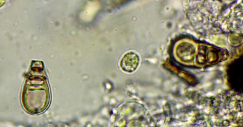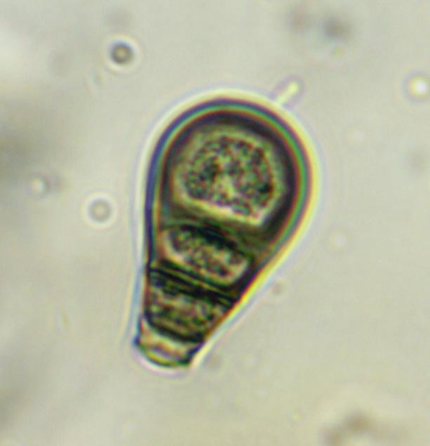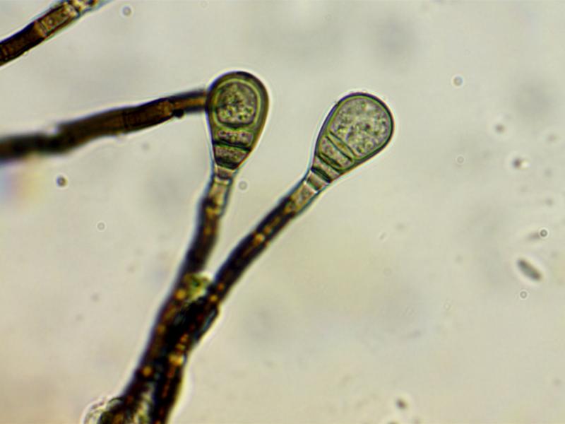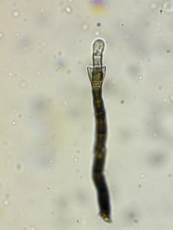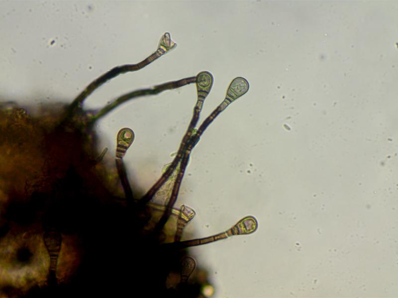 Recently I collected what I thought to be a setose pyrenomycete on a broad leaved twig in fenland. It turned that the 'setae' were, in fact, a hyphomycete growing on old pyreno ascomata. The conidiophores were up to about 250 long and the conidia 20-23x11-14. The conidia were initially hyaline and thin-walled but became thick-walled and olivaceous brown on maturity. The detached conidia were 3-septate. I think it is an Endophragmia but I can't be sure which one.