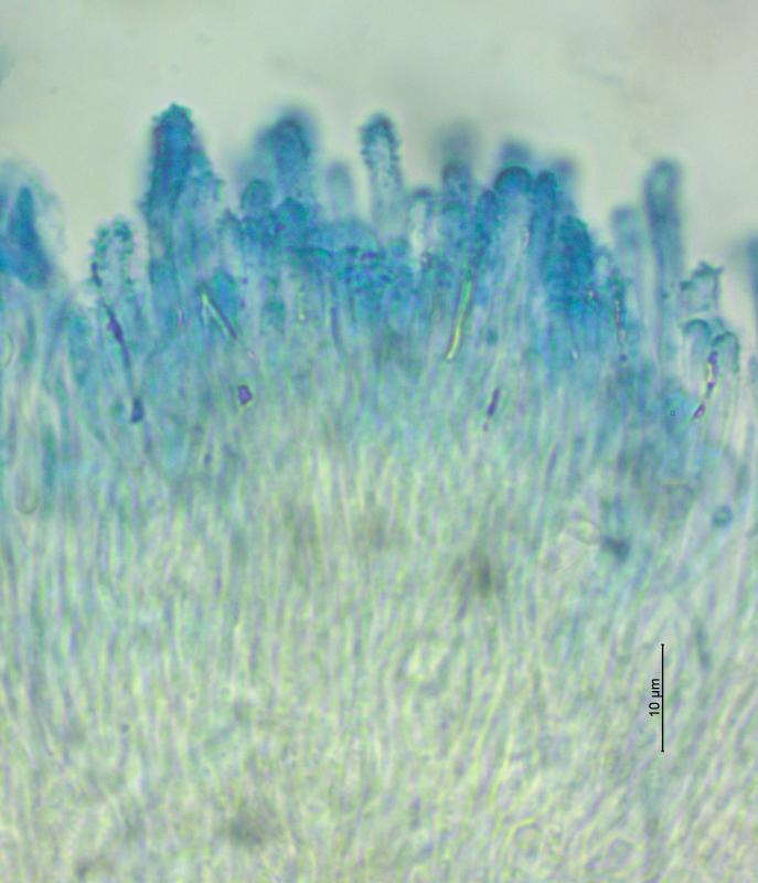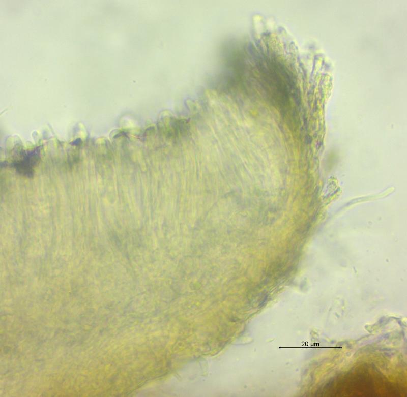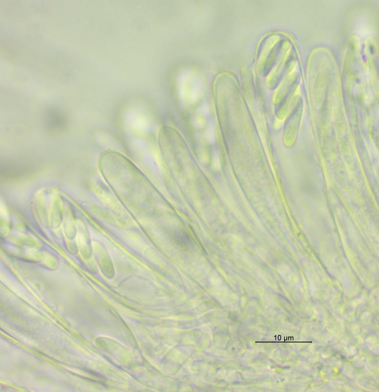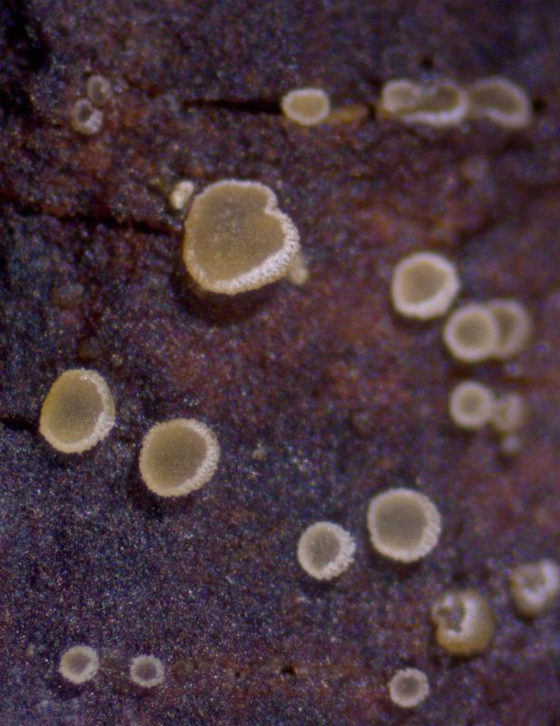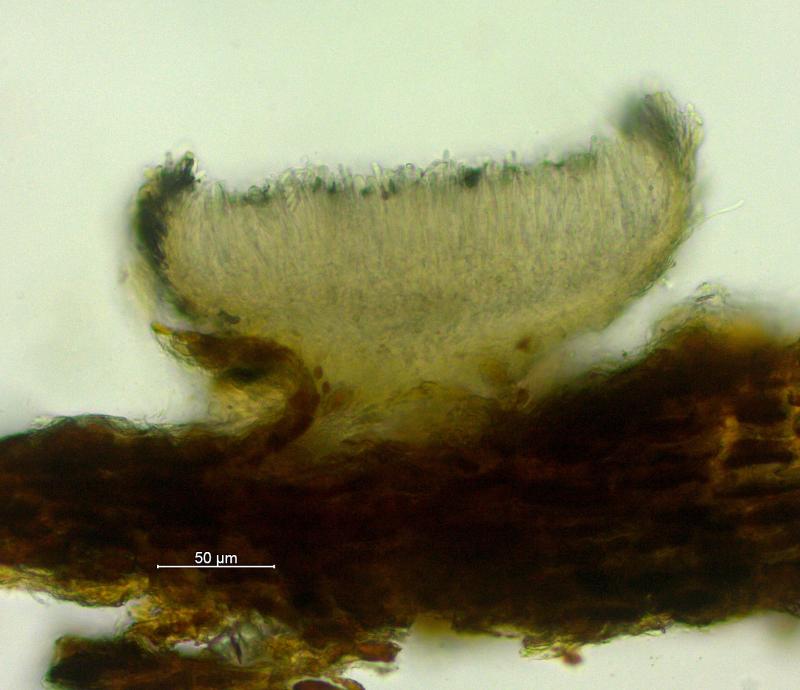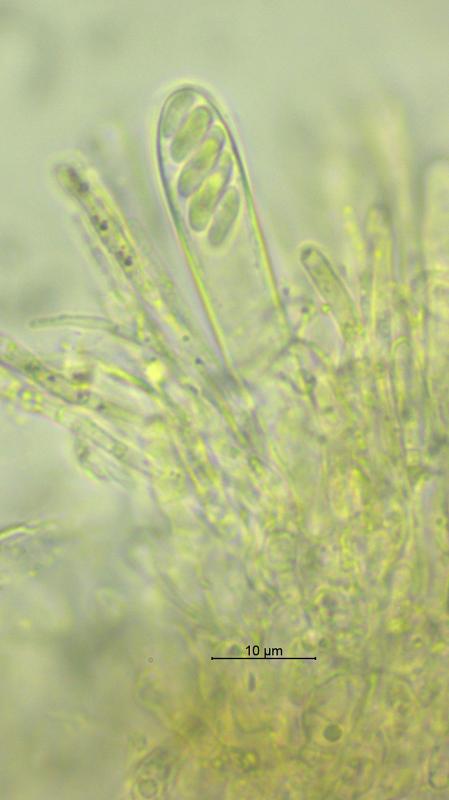 Trouvé sur branche de Prunus spinosa (Buisson mésophiles/817 m). Apothécies gris/crème, 0.25 - 0.6 mm de diamètre, surface externe et marge cuvertes de poils, asques 47 - 57 x 7 - 8 µm, crochet+, IKI-, KOH/MLZ-, ascospores 8 - 10 x 2.25 - 2.75 µm, paraphyses légèrement élargies au sommet, septées. Je n'ai pas trouvé d'espèce correspondante. Merci d'avance pour vos avis.