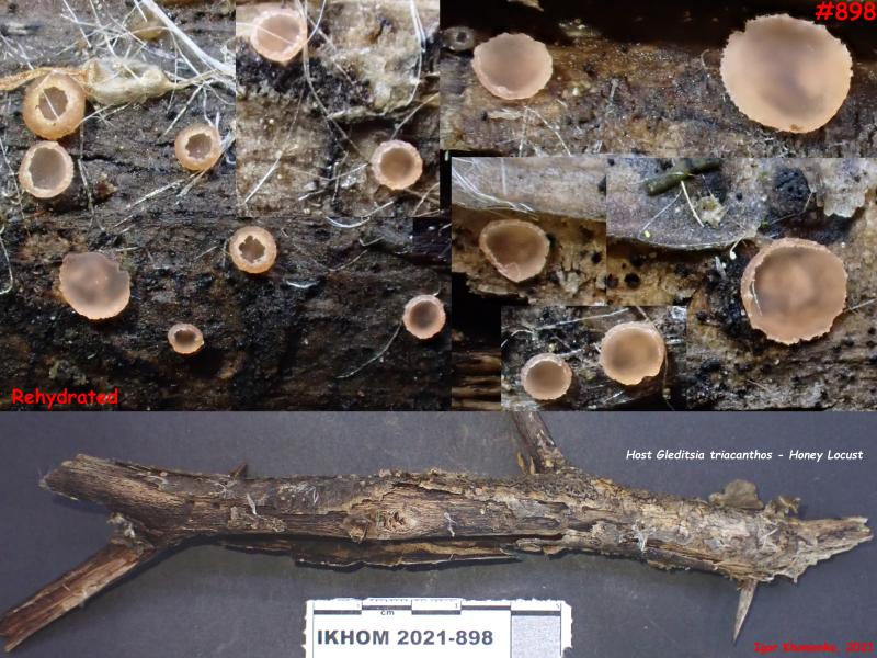 Apothecia were on top of the bark of a broken branch of Gleditsia triacanthos (Honey Locust), on the ground.