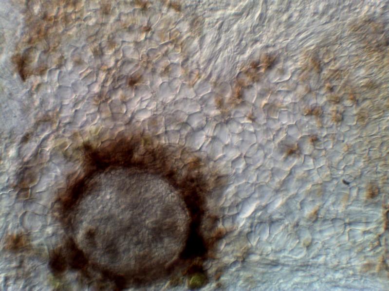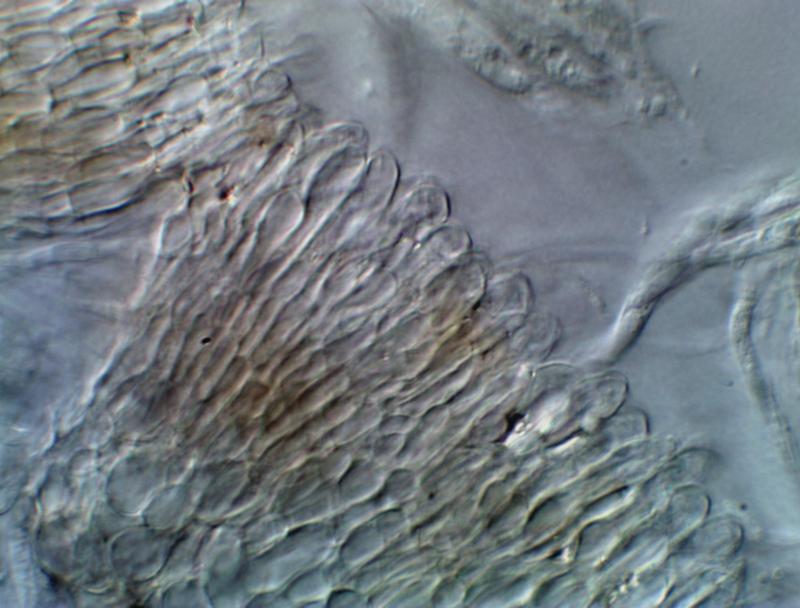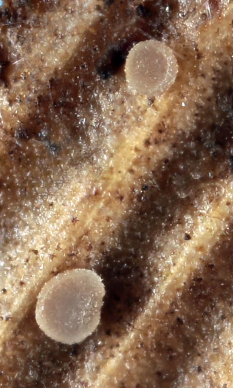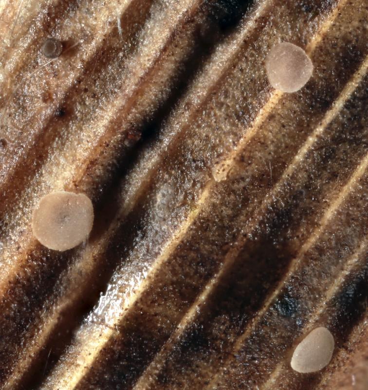 Apothecia colourless or with a faint pinkish tinge, no protruding hairs, up to 0.4mm. They are sessile and leave a brown attachment ring, though this may just be remnants of host tissue. The margin is as seen in the final image - without protruding cells/hairs; the terminal cells c. 5-6µm wide.