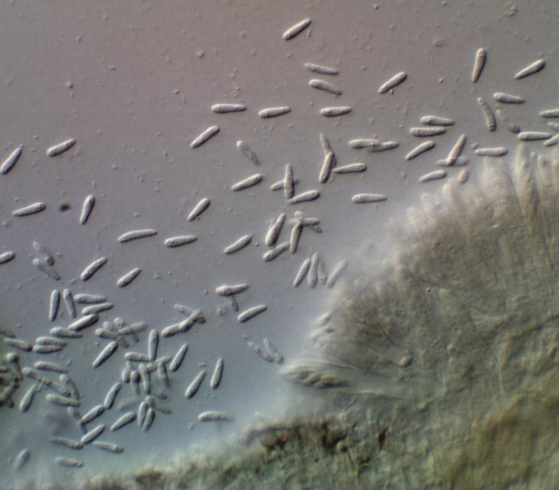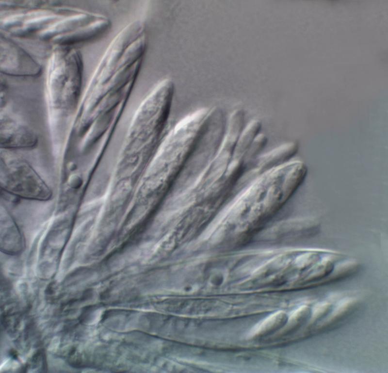 Ascospores mostly clavate, with small droplets towards (but not at) the apices; 8.8-10.8 x 2.4-2.7µm, Qe = 3.8.