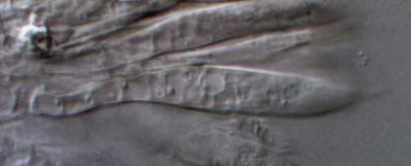 Asci 8-spored, apex blue in Baralsche Löhsung, with croziers. Quite a number of the asci (at a particular stage of development) with 1-4 "Psilachnum bodies" their size dependant on how many there are. One particular developing ascus (see image) was divided into a number of vacuoles, each with a single globular body - very active (Brownian motion?).