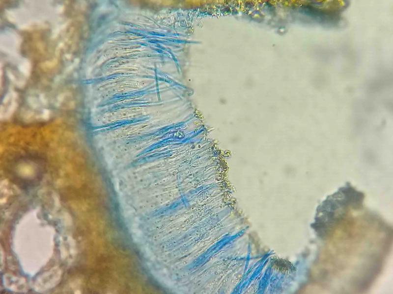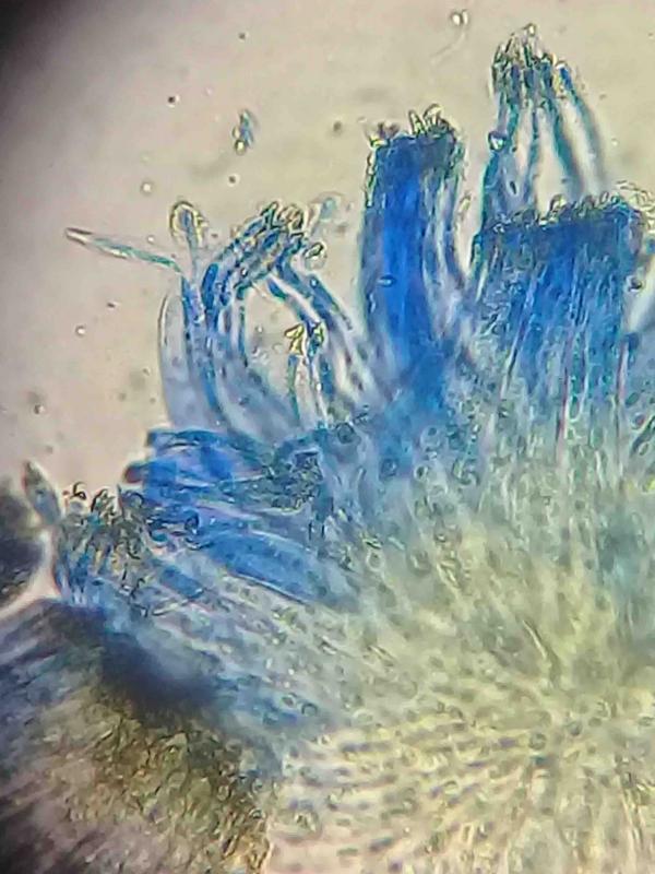 I found these fruit bodies on pine needles. On some needles they were black, and on others they were not black. For the black ones Lophodermium pinastri seems a good match. For the none black ones I am not sure if they are L. pinastri? maybe L. concolor ?the paraphyses have kind of crystals or mucilage on their top.