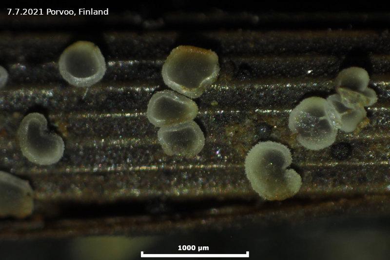 this could be Mollisia citrinopigmentosa Svrcek may be, but I have not seen the type and no real idea of this species. The spores are said to contain no oil drops, but theses data are from dead spores and have to be taken with care.