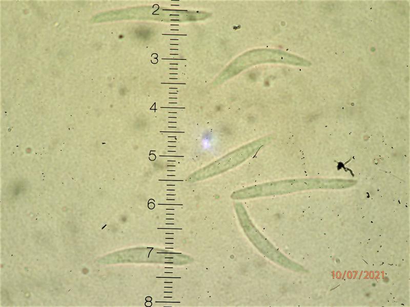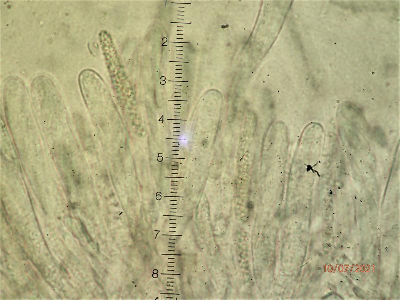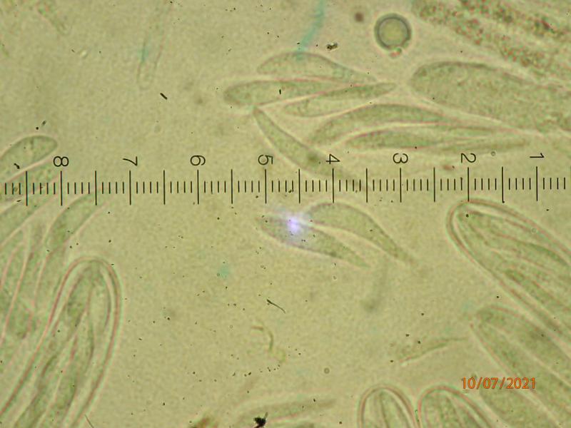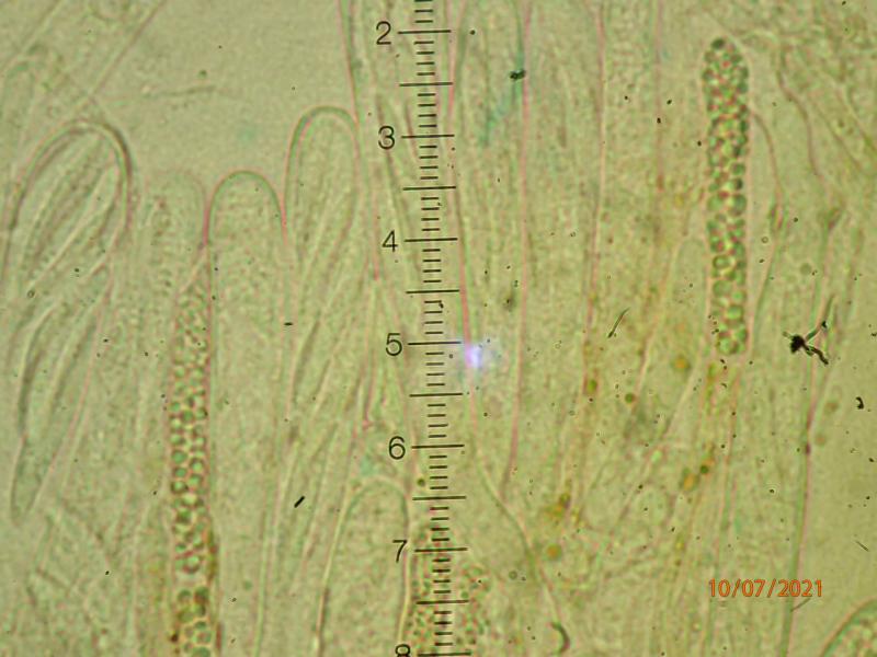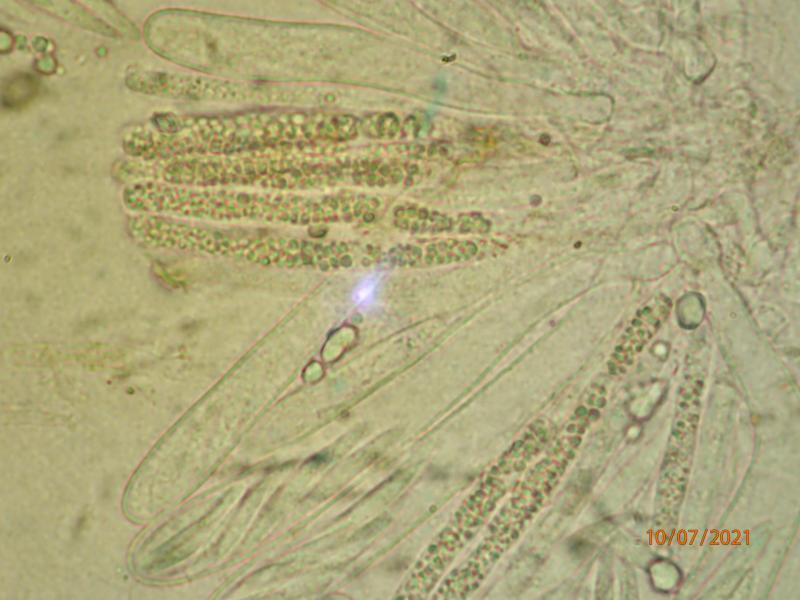 Asci 65-80 x 7-9 micr, IKI neg. No croziers seen. Paraphyses ca. 5 micr broad, filled with slightly yellowish guttules. Spores 19-25 x 3-4 micr, fusiform, often bent, tending to form a lump at the ascus upper half and released as such. All photos from fresh material, mounted in water.