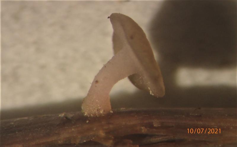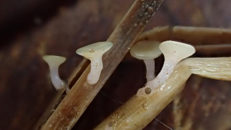 These tiny (1-3 mm diam) stalked apothecia were growing on Eriophorum angustifolium culms in a very wet place (submerged), 850 m alt. in Norway. Hymenium flat or slightly convex, stipe with a slight pinkish hue. No sclerotium or stromatised tissue, so I guess not Sclerotiniaceae.