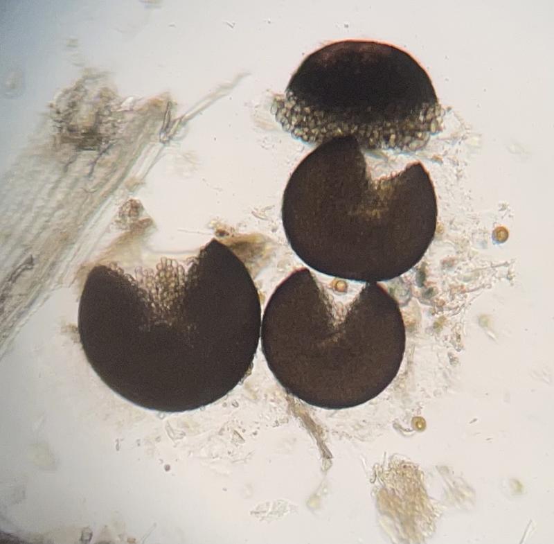 I think these are probably the remains of expelled Pilaira sporangia, which one can often find on the surface of the dung - see http://www.naturefg.com/pages/b-fungi/pilaira%20anomala.htm