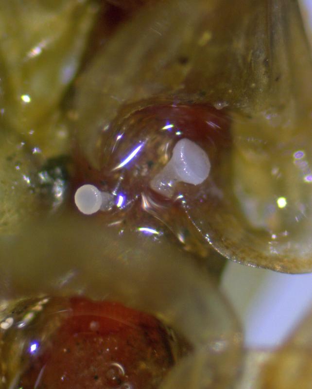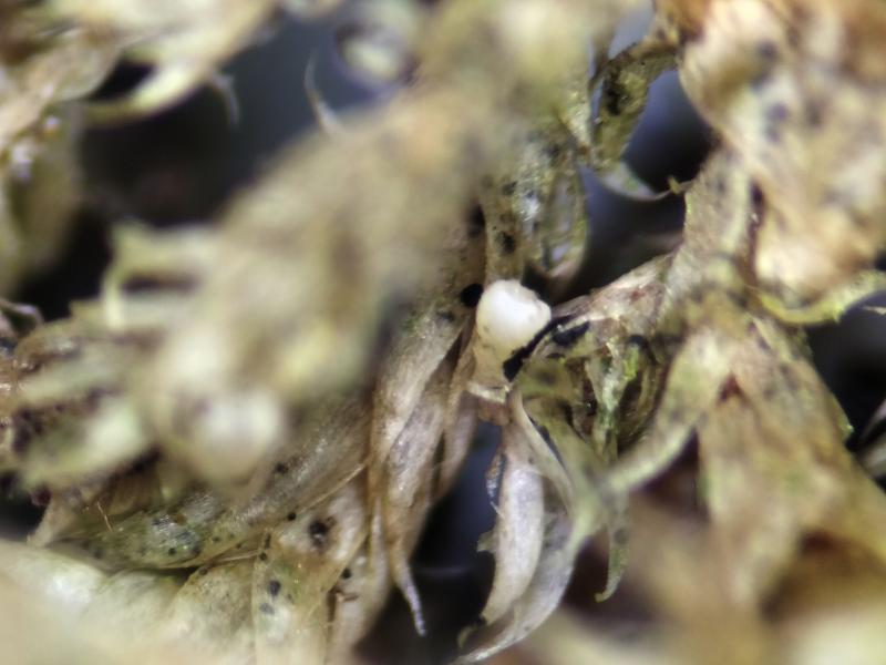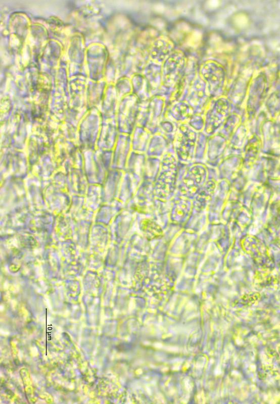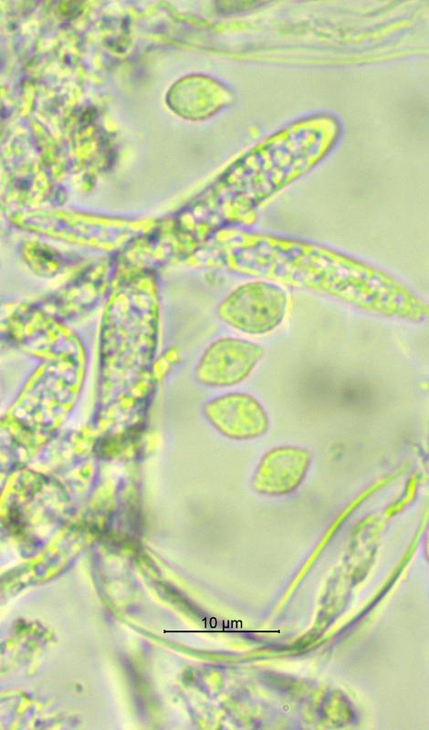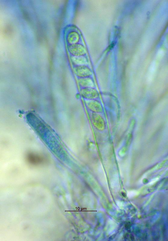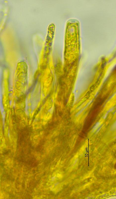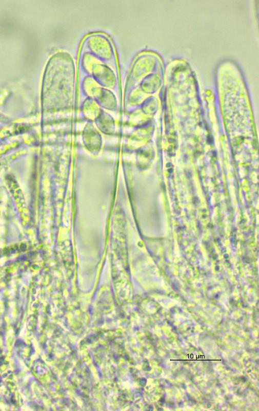 Récolte réalisé sur Rhytidiadelphus (Pessière sur tourbe à 1'017 m), apothécies 0.15 - 0.5 mm de diamètre, blanc, stipitée, asques 60 - 75 x 6 - 8 µm, avec crochets, octosporés, IKI-, IKI/KOH+, spores 4.5 - 6 x 3 - 4 µm, finement verrruqueuse, hyalines, paraphyses non renflées au sommet, garnies de petites guttules. Merci d'avance.