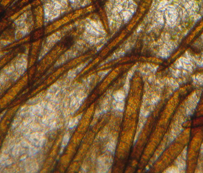 The hairs are brown, 0-3 septate, 100-280x10-25.