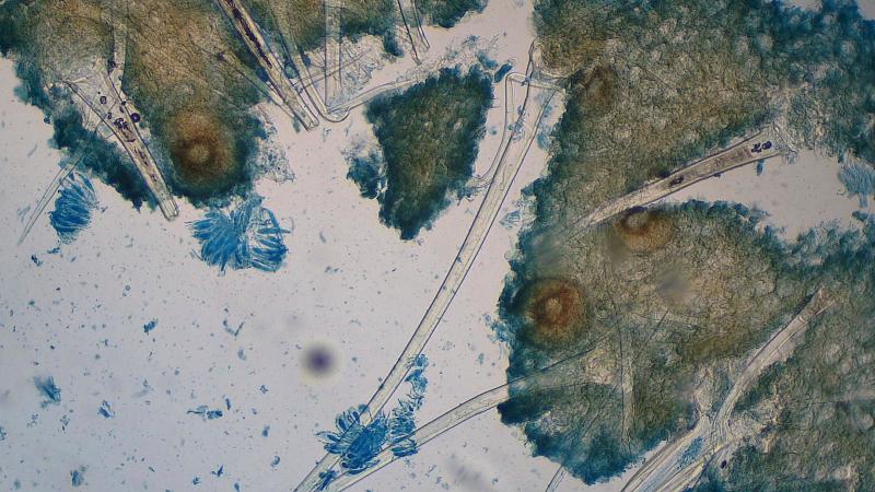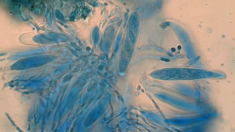 Spores hyalines, monoseptées à maturité, 11-13x 2,5-3 µm.