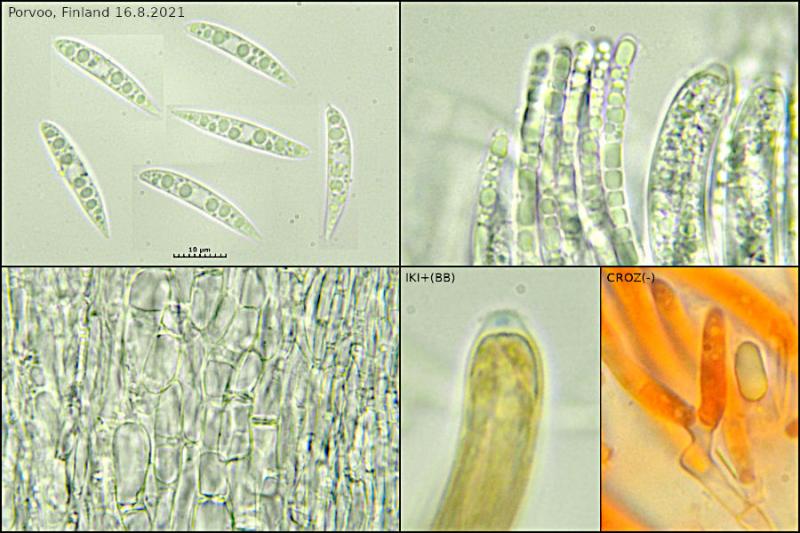 IKI+(bb), no croziers. The spores have a small cilium at both ends and measure 24 - 27.1 × 3.9 - 4.5 µm.
