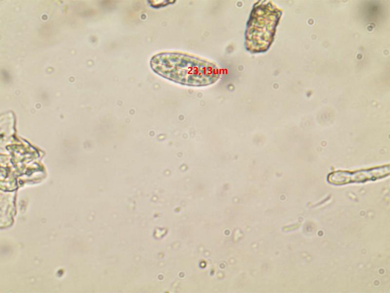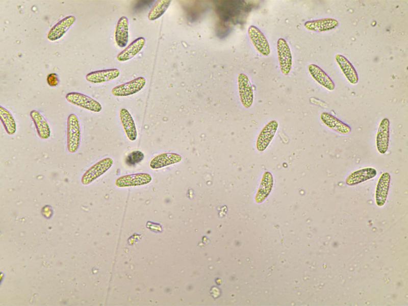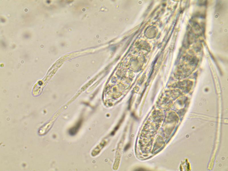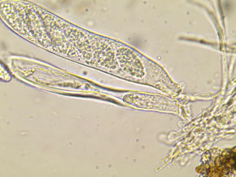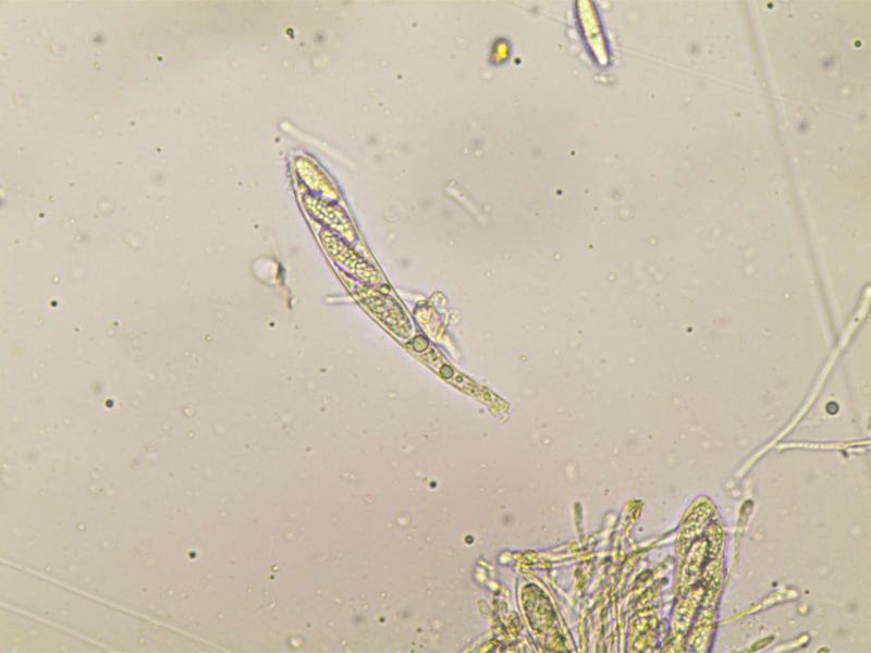 Les asques sont J-, avec crochet, 102X16 µ. Generalement 8 spores, mais je crois avoir vu également 4 spores.