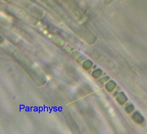 Paraphyses étroitement cylindriques avec des vacuoles réfringentes (VBS) fixant le bleu de crésyl