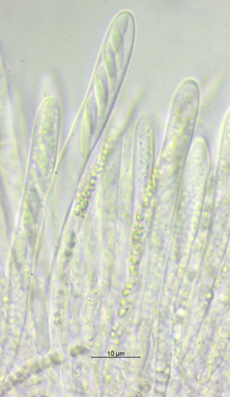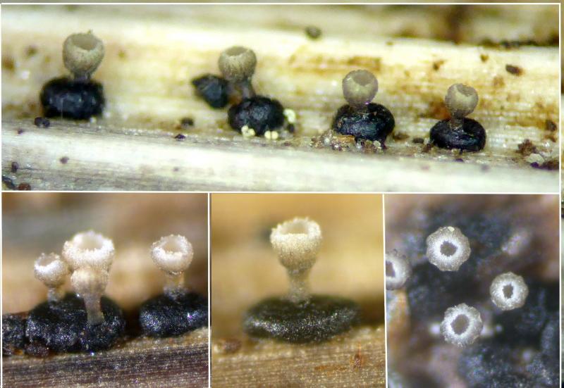 Sur les tiges mortes et les inflorescences de cirse épineux (Cirsium spinosissimum/2'615 m) de l'année précédente, sous des plantes vivantes dans des endroits humides. Apothécies de 1,5 - 4 mm de diamètre, stipitées, nombreuses sur les sclérotes, spores 7 - 12 x 2,5 - 3 µm, lisses, hyalines, asques 81 - 90 x 5 - 6,5 µm, amyloïdes, crochet+, paraphyses droites, remplies de gouttelettes. Merci d'avance.