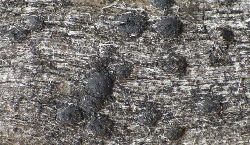 Ascomes globuleux, mesurant 1,5 mm de diamètre, isolés, grégaires, papillés, érumpants, noirs.