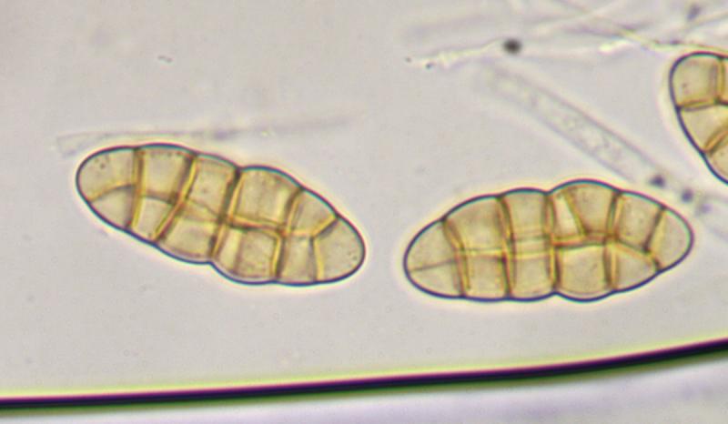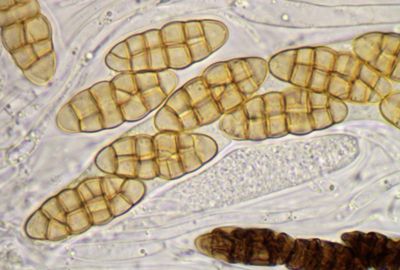 Ascospores : 30-34 x 11,5-13 µm, mûriformes, avec 5 septas transversaux, brun clair (ascospores mortes brun foncé), resserrées au niveau des cloison mais plus intensément au niveau du centre.