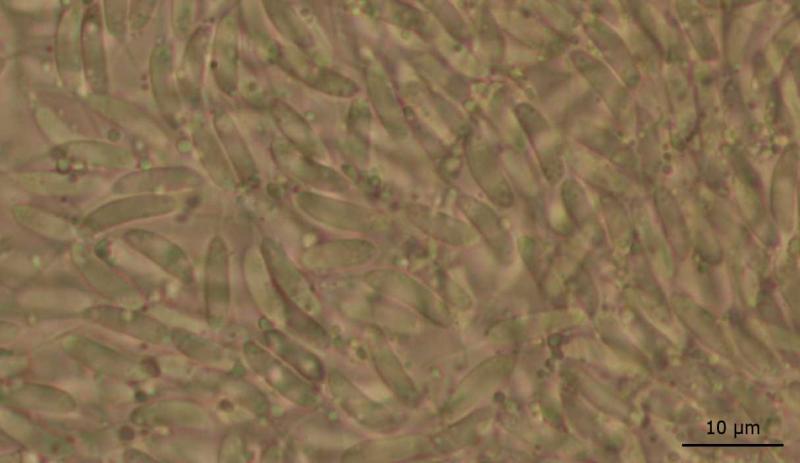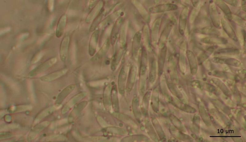 Conidia have two appendages 6-8 micrometers long, are hyaline, sometimes slightly curved, smooth, aseptate.