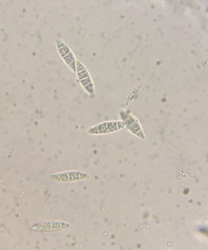 spores 17-19 x5-6 um 3 septate (pict in koh)