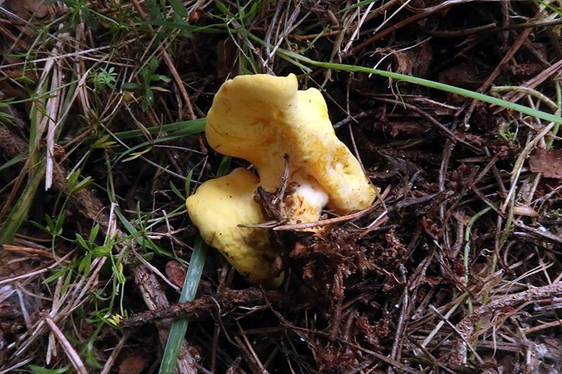 De unos 5 o 6 cm., con un rudimentario pie sin costillas, de color amrillo limón en su parte interna y tonos más pálidos en la parte externa, con forma de copa.